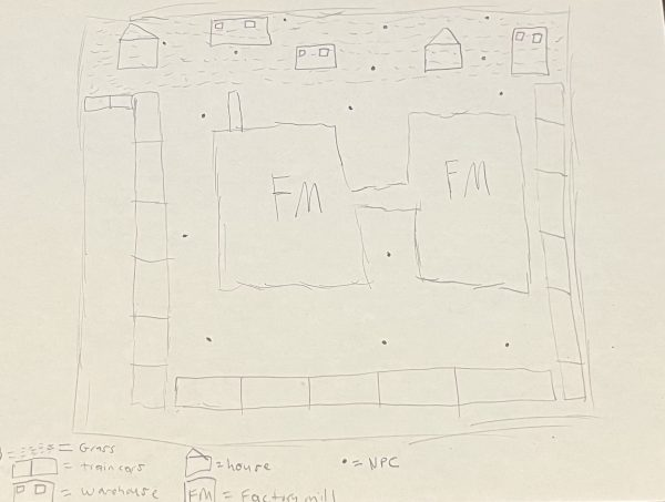 With inspirations from the Call of Duty map “Gun Runner”, and the combat tone of Hitman and Metal Gear Solid 5, I sketched out a paper design to use as a guide for the level layout. from the train cars used as barriers to keep the player in bound, to the factory mills in the middle of the map, and enemies placed in many areas in this open space, the map was going to allow for player freedom on how to tackle the situation when it comes to taking out the enemies.